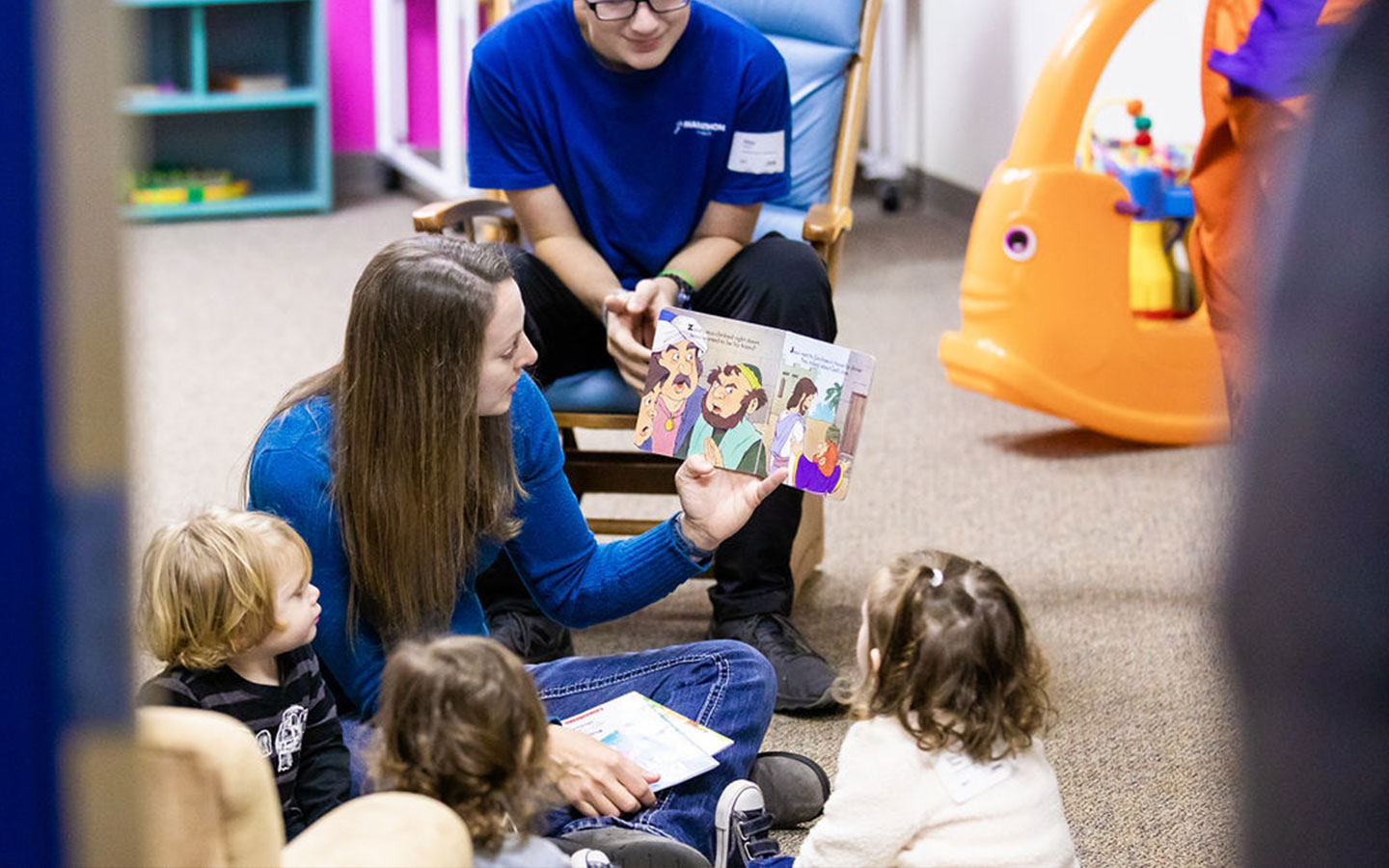 At Marathon Kids our number one goal is that families feel loved and welcomed. When you arrive we will check you in, give your kids a little suprise, and give you a tour of where your child will be having fun. While they are with us they will be in a loving, fun, Jesus-filled environment!
